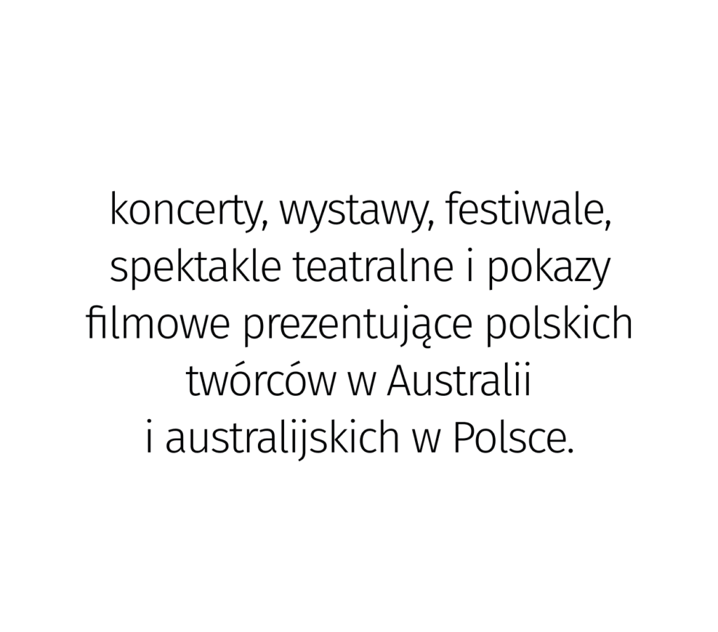 Upowszechniamy i rozwijamy kulturę oraz sztukę australijską w Polsce i polską w Australii. Zwiększamy dostęp społeczeństwa do dziedzictwa obu narodów, pobudzamy ciekawość i promujemy talenty, które przekraczają granice geograficzne i kulturowe.